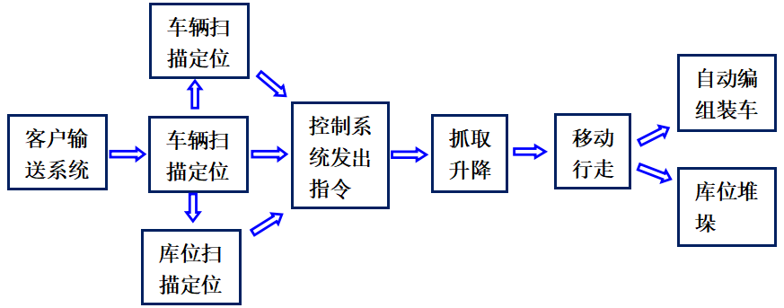 噸袋全自動(dòng)裝車機(jī)系統(tǒng)通過(guò)視覺(jué)自動(dòng)讀取車輛信息,然后跟系統(tǒng)信息比對(duì)確認(rèn)獲取裝車數(shù)據(jù)(成品垛數(shù)量)后,自動(dòng)啟動(dòng)激光掃描系統(tǒng)掃描車輛位置信息,形成車箱的長(zhǎng)寬高及停放角度信息。根據(jù)托盤的尺寸和車廂長(zhǎng)寬,智能化生成車輛裝車數(shù)據(jù),并將數(shù)據(jù)傳送給裝車系統(tǒng),系統(tǒng)初始化裝車數(shù)據(jù),啟動(dòng)裝車程序進(jìn)行裝車,輸送機(jī)將噸包物料送到裝車機(jī)抓取工位,裝車智能吊裝系統(tǒng)根據(jù)設(shè)定程序和車輛數(shù)據(jù),全自動(dòng)完成裝車工作。