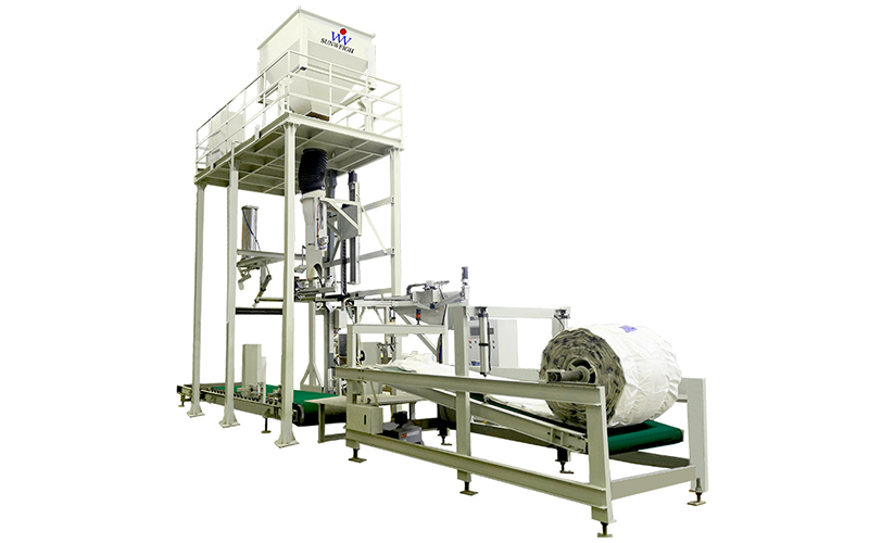 首先,工人將成卷的工業(yè)鹽噸袋用叉車插到噸袋包裝機(jī)空袋輸送機(jī)上,空袋輸送機(jī)將單個(gè)包裝袋輸送前移,當(dāng)空袋袋口到達(dá)全自動(dòng)噸袋包裝機(jī)開袋處,上下吸盤將包裝袋袋口打開,上袋機(jī)械手夾住工業(yè)鹽包裝袋袋口,然后將包裝袋自動(dòng)套在包裝機(jī)下料口上,檢測(cè)開關(guān)檢測(cè)到套袋成功后,夾袋夾自動(dòng)夾袋,吹袋機(jī)構(gòu)將包裝袋吹起,方便物料均勻的沖入包裝袋,吹氣完畢,全自動(dòng)噸袋包裝機(jī)自動(dòng)將稱量好的物料一次性放到包裝袋內(nèi),同時(shí)除塵系統(tǒng)工作除塵,裝袋完畢,熱合裝置封袋,輸送機(jī)將包裝好的成品工業(yè)鹽噸袋自動(dòng)輸出,完成工業(yè)鹽的全自動(dòng)噸袋包裝。